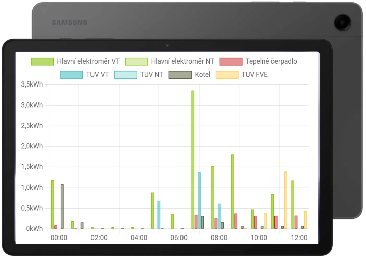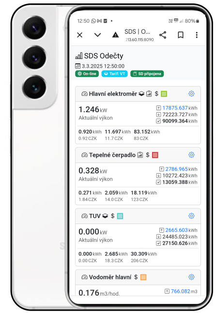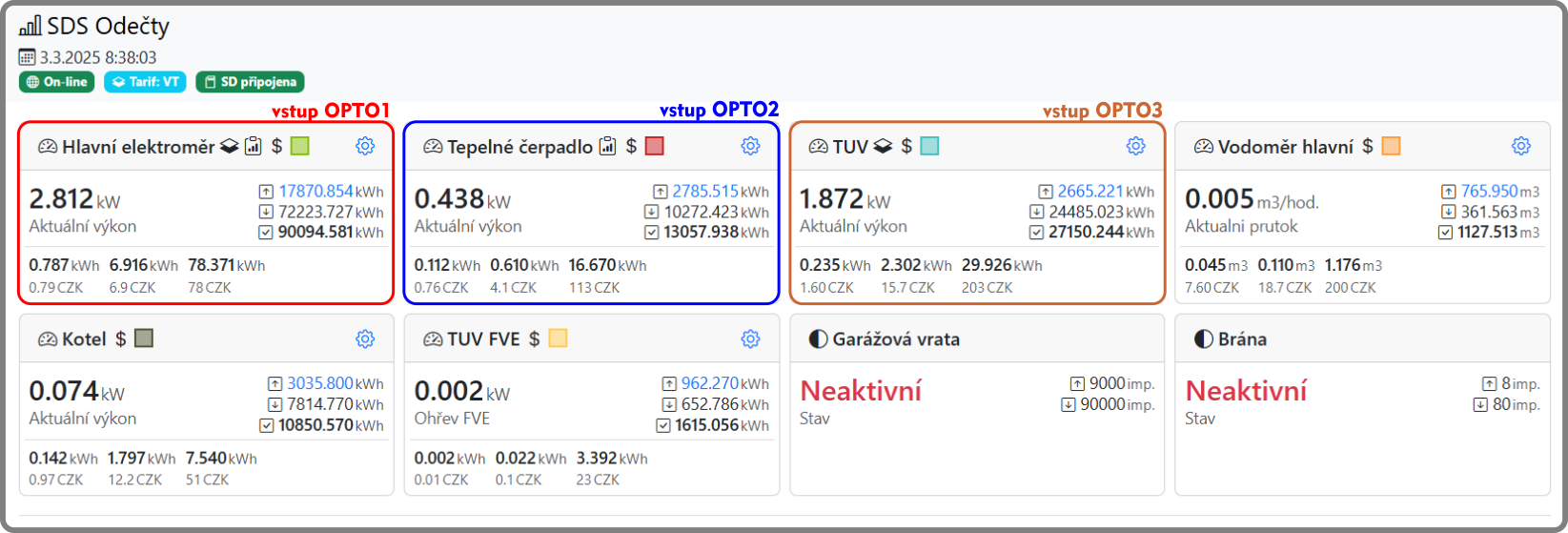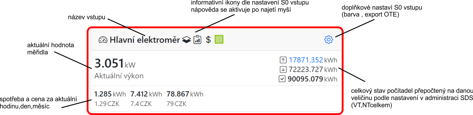 Pro každý jednotlivý S0 vstup je na stránce v horní části samostatný panel, ve kterém jsou zobrazeny všechny možné informace a tyto informace se dynamicky mění v pravidelných časových intervalech.
