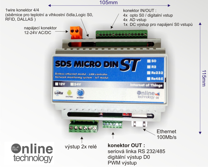 Monitorovací a řídící PLC/PAC modul SDS MICRO verze „ST“ s ethernetovým rozhraním LAN.Kombinuje chytré IoT řešení vzdáleného řízení, sledování a kontrolu několika funkcí a dat najednou.Modul nabízí jednoduché zapojení a okamžitý přístup k jednotlivým funkcím přes webové rozhraní, android aplikaci , HTML stránky nebo cloudové služby na portálu