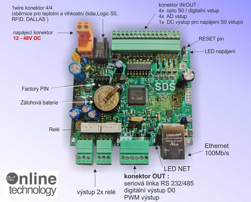 Nový modul výrobků SDS MICRO ST DP pokračuje v úspěšném modelu verze SDS MICRO E a ST . Novější HW řešení přináší navíc další S0 vstup, zálohovou baterii pro měření S0 vstupů, násuvné svorkovnice a hlavně nový procesor , který umožňuje rychlejší a stabilnější nahrání nového firmwaru. ST DP verze má navíc napájení až do 65V DC nebo 40V AC. Je dodávám jak pro uchycení na DIN lištu tak i jako samostatná deska (LIGHT verze). U této verze není již potřeba rozlišovat napájení podle použití relé. Další novinkou je udržení a aktualizace reálného času i při výpadku napájení (reálný čas udržován v chodu z baterie). Tento typ je bez osazených relé na desce.